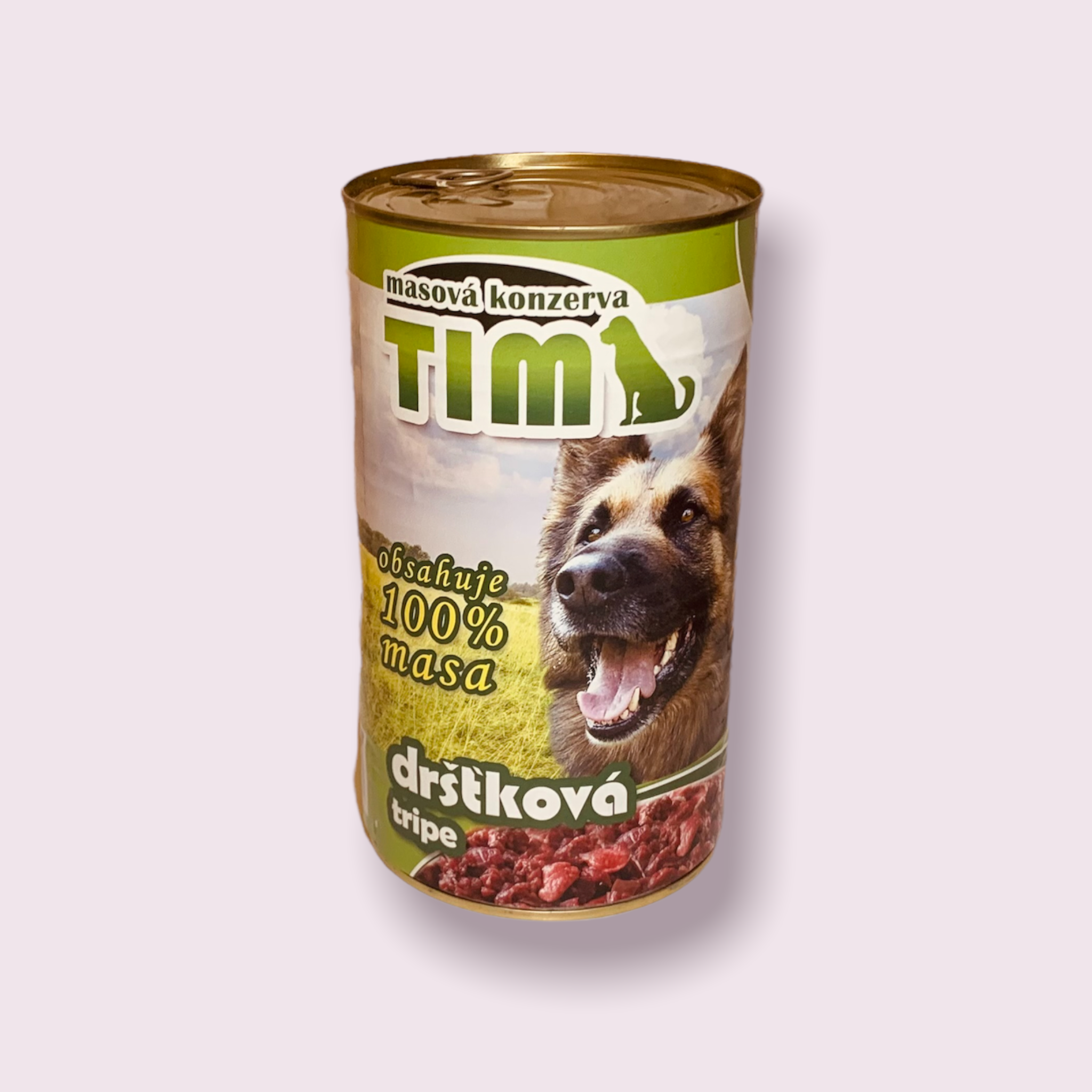 Konzerva obsahuje mleté hovězí maso, mleté hovězí droby a hovězí dršťky mleté. Hovězí maso patří k nejhodnotnějším druhům masa. Obsahuje asi 23% bílkovin, 3-6% tuku, velké množství železa, vitamíny skupiny B a esenciální aminokyseliny. Je velice výživné, vhodné pro psy v rekonvalescenci, pro psy v zátěži a pro malá štěňata. Neprané dršťky obsahují asi 14% bílkovin, asi 10% tuku a minerální látky (fosfor, vápník). Obsahují částečně natrávené rostlinné zbytky potravy, které jsou pro psa velice dobře stravitelné. Dršťky jsou velmi výživné, a proto by měly být součástí jídelníčku každého pejska alespoň jednou týdně, a to i v případě jídelníčku dietního. Pro štěňata jsou vhodné asi od 4. týdne. Konzerva obsahuje 100% masa. Vhodná na cesty, dovolené, kde není možné podávat pejskovi mražené maso. Ocení ji štěňata a pejsci malých plemen.